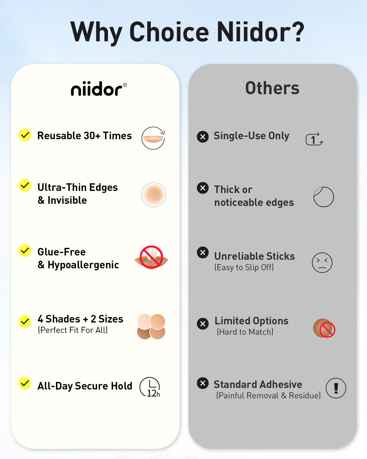 Yes, Niidor's nipple covers are available in a range of skin tones, allowing you to choose the shade that best matches your complexion. This ensures a natural and invisible look, enhancing your confidence and comfort no matter the outfit.